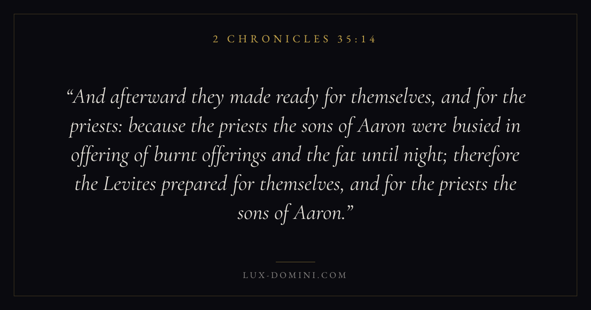 And afterward they made ready for themselves, and for the priests: because the priests the sons of Aaron were busied in offering of burnt offerings and the fat until night; therefore the Levites prepared for themselves, and for the priests the sons of Aaron.