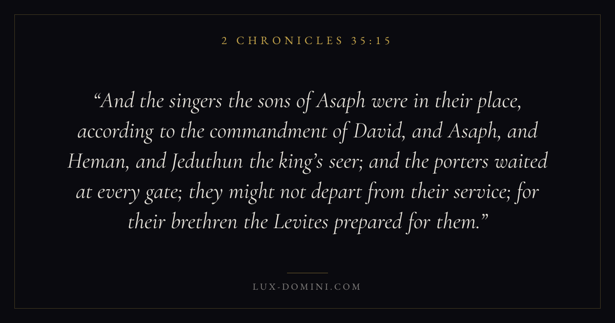 And the singers the sons of Asaph were in their place, according to the commandment of David, and Asaph, and Heman, and Jeduthun the king’s seer; and the porters waited at every gate; they might not depart from their service; for their brethren the Levites prepared for them.