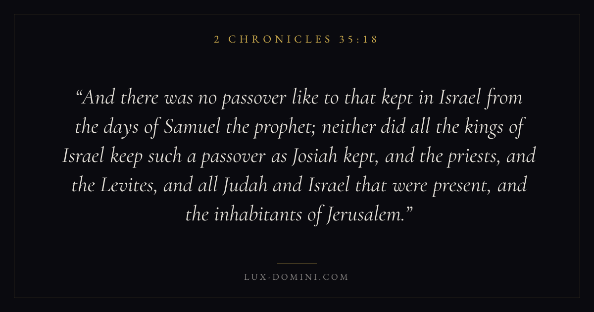 And there was no passover like to that kept in Israel from the days of Samuel the prophet; neither did all the kings of Israel keep such a passover as Josiah kept, and the priests, and the Levites, and all Judah and Israel that were present, and the inhabitants of Jerusalem.