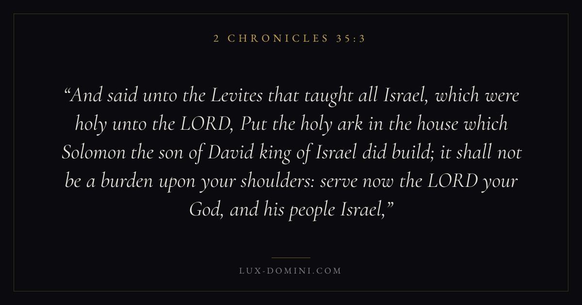 And said unto the Levites that taught all Israel, which were holy unto the LORD, Put the holy ark in the house which Solomon the son of David king of Israel did build; it shall not be a burden upon your shoulders: serve now the LORD your God, and his people Israel,