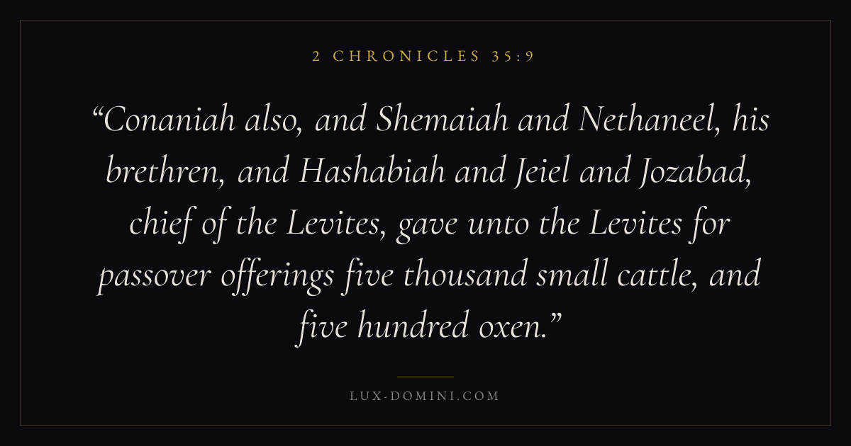Conaniah also, and Shemaiah and Nethaneel, his brethren, and Hashabiah and Jeiel and Jozabad, chief of the Levites, gave unto the Levites for passover offerings five thousand small cattle, and five hundred oxen.