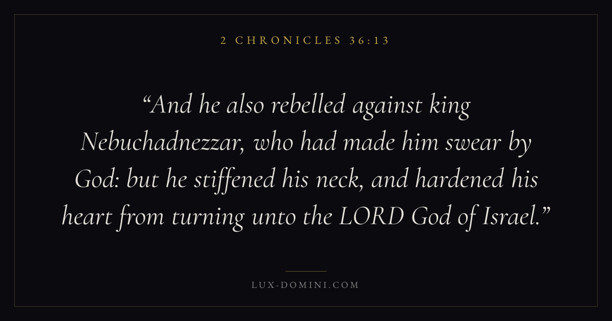 And he also rebelled against king Nebuchadnezzar, who had made him swear by God: but he stiffened his neck, and hardened his heart from turning unto the LORD God of Israel.