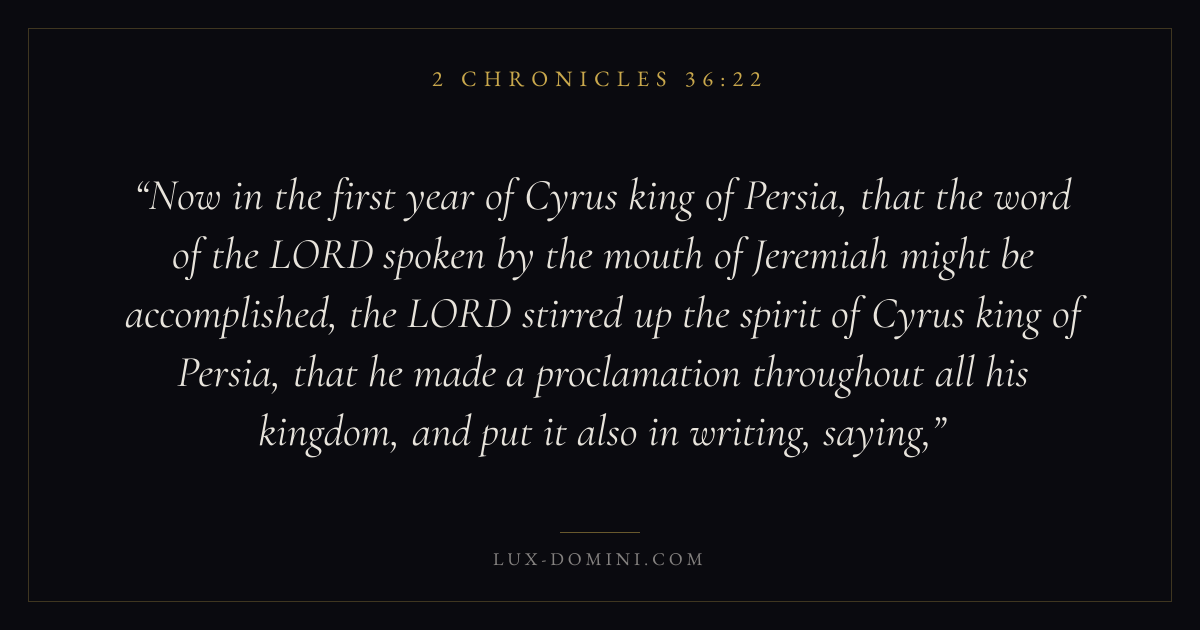 Now in the first year of Cyrus king of Persia, that the word of the LORD spoken by the mouth of Jeremiah might be accomplished, the LORD stirred up the spirit of Cyrus king of Persia, that he made a proclamation throughout all his kingdom, and put it also in writing, saying,