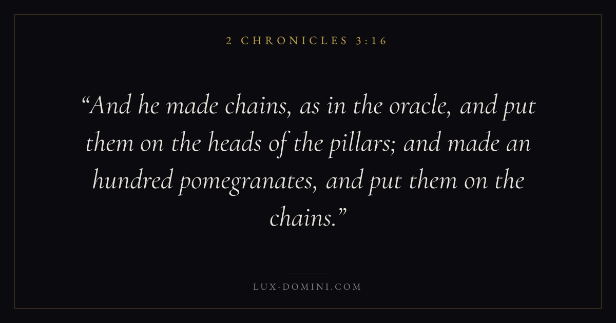 And he made chains, as in the oracle, and put them on the heads of the pillars; and made an hundred pomegranates, and put them on the chains.