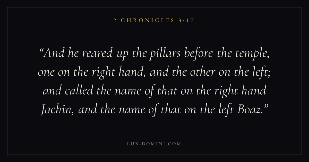 And he reared up the pillars before the temple, one on the right hand, and the other on the left; and called the name of that on the right hand Jachin, and the name of that on the left Boaz.