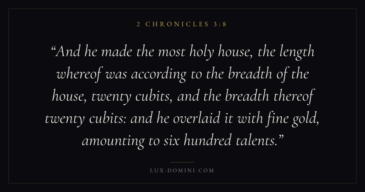 And he made the most holy house, the length whereof was according to the breadth of the house, twenty cubits, and the breadth thereof twenty cubits: and he overlaid it with fine gold, amounting to six hundred talents.