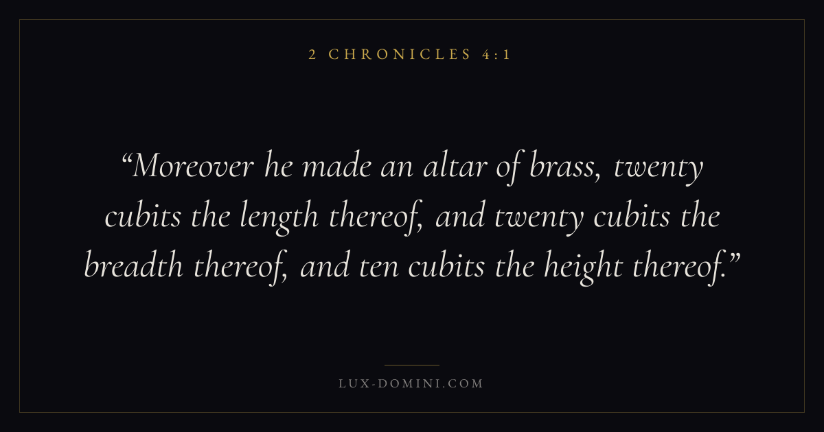 Moreover he made an altar of brass, twenty cubits the length thereof, and twenty cubits the breadth thereof, and ten cubits the height thereof.