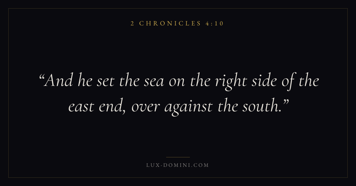 Books / 2 Chronicles / Chapter 4 / Verse 10 ← 2 Chronicles 4:9 2 Chronicles 4:10 2 Chronicles 4:11 → And he set the sea on the right side of the east end, over against the south. Download verse card Share on Twitter Share on Facebook Pin it ✦ Key themes PrayerJustice and mercyTempleReform Read with 2 Chronicles 4:9Matthew 6:9Luke 18:1Micah 6:8 Related topics Bible verses about prayerBible verses about justice and mercy ✦ 2 Chronicles Chapter 4 verses V. 1 V. 2 V. 3 V. 4 V. 5 V. 6 V. 7 V. 8 V. 9 V. 10 V. 11 V. 12 V. 13 V. 14 V. 15 V. 16 V. 17 V. 18 V. 19 V. 20 V. 21 V. 22