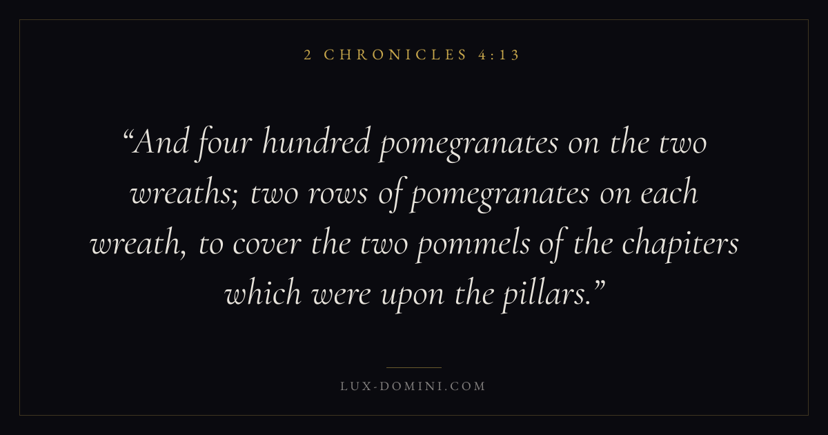 And four hundred pomegranates on the two wreaths; two rows of pomegranates on each wreath, to cover the two pommels of the chapiters which were upon the pillars.