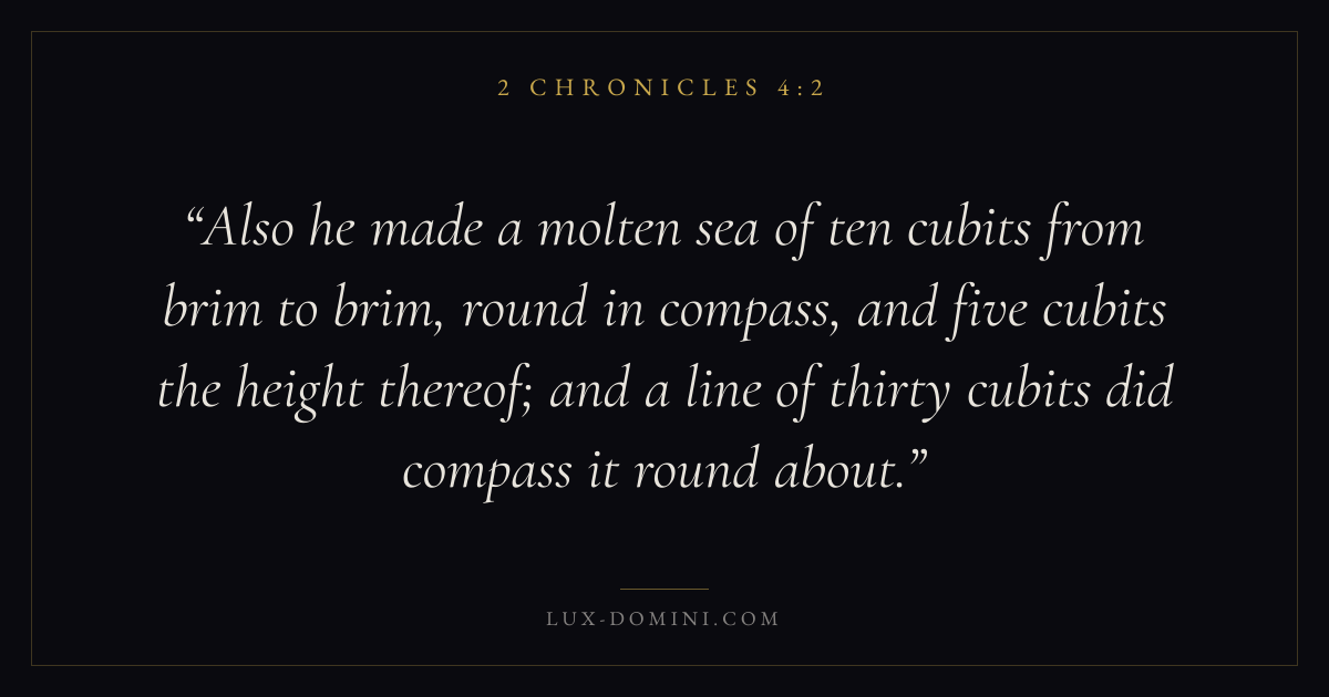 Also he made a molten sea of ten cubits from brim to brim, round in compass, and five cubits the height thereof; and a line of thirty cubits did compass it round about.