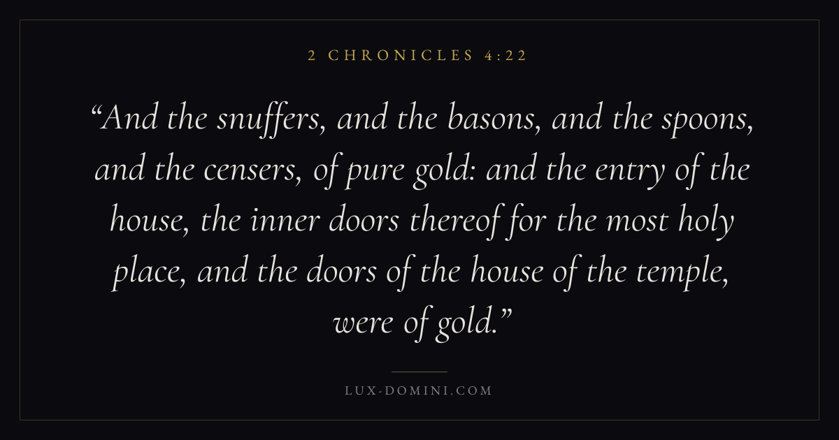 And the snuffers, and the basons, and the spoons, and the censers, of pure gold: and the entry of the house, the inner doors thereof for the most holy place, and the doors of the house of the temple, were of gold.