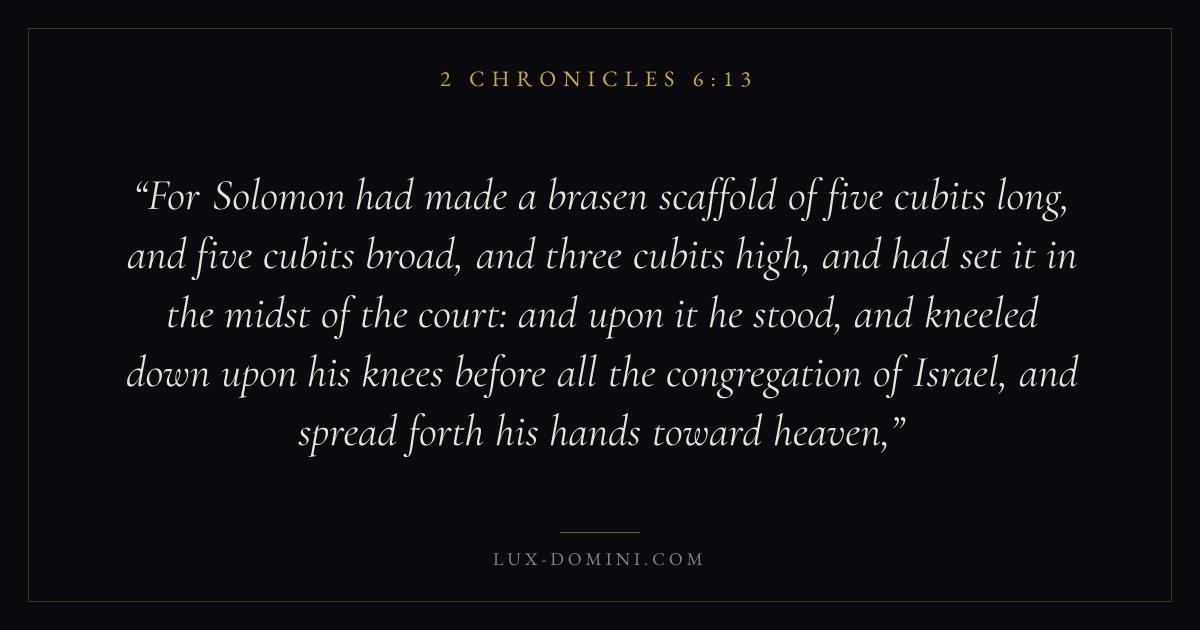 For Solomon had made a brasen scaffold of five cubits long, and five cubits broad, and three cubits high, and had set it in the midst of the court: and upon it he stood, and kneeled down upon his knees before all the congregation of Israel, and spread forth his hands toward heaven,