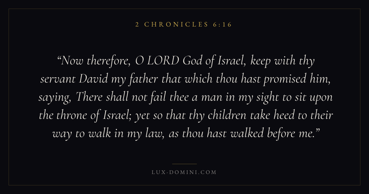 Now therefore, O LORD God of Israel, keep with thy servant David my father that which thou hast promised him, saying, There shall not fail thee a man in my sight to sit upon the throne of Israel; yet so that thy children take heed to their way to walk in my law, as thou hast walked before me.