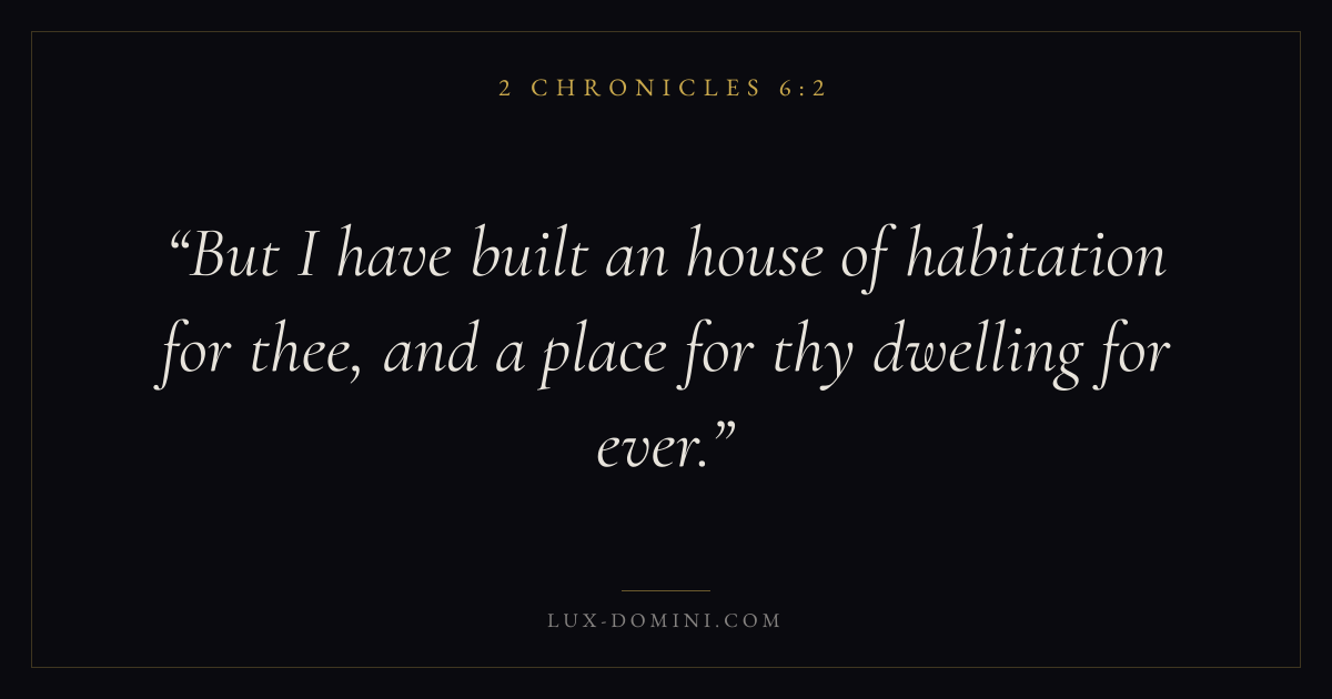 Books / 2 Chronicles / Chapter 6 / Verse 2 ← 2 Chronicles 6:1 2 Chronicles 6:2 2 Chronicles 6:3 → But I have built an house of habitation for thee, and a place for thy dwelling for ever. Download verse card Share on Twitter Share on Facebook Pin it ✦ Key themes PrayerJustice and mercyTempleReform Read with 2 Chronicles 6:12 Chronicles 6:3Matthew 6:9Luke 18:1 Related topics Bible verses about prayerBible verses about justice and mercy ✦ 2 Chronicles Chapter 6 verses V. 1 V. 2 V. 3 V. 4 V. 5 V. 6 V. 7 V. 8 V. 9 V. 10 V. 11 V. 12 V. 13 V. 14 V. 15 V. 16 V. 17 V. 18 V. 19 V. 20 V. 21 V. 22 V. 23 V. 24 V. 25 V. 26 V. 27 V. 28 V. 29 V. 30 V. 31 V. 32 V. 33 V. 34 V. 35 V. 36 V. 37 V. 38 V. 39 V. 40 V. 41 V. 42