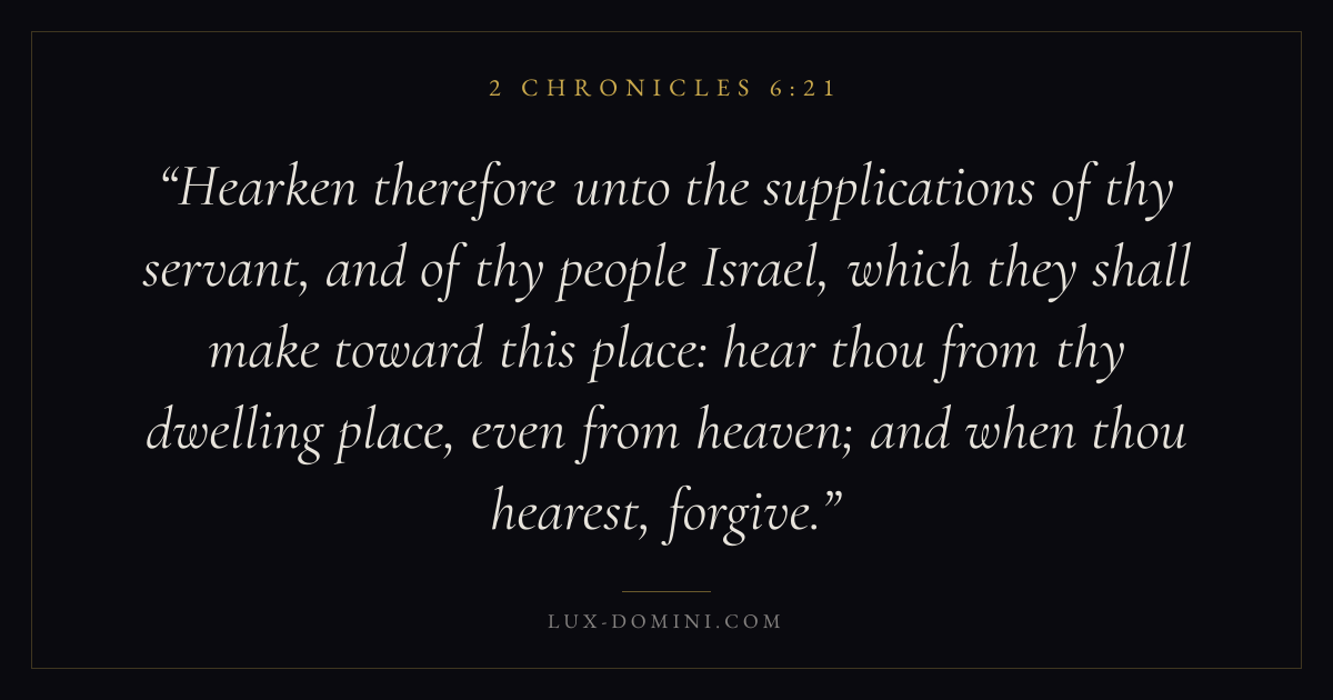 Hearken therefore unto the supplications of thy servant, and of thy people Israel, which they shall make toward this place: hear thou from thy dwelling place, even from heaven; and when thou hearest, forgive.
