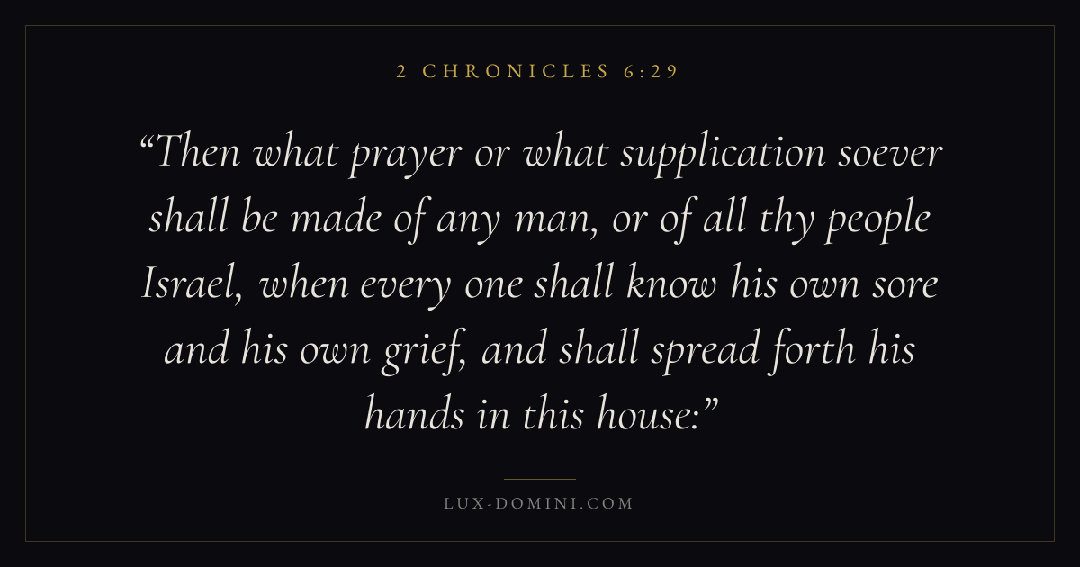 Then what prayer or what supplication soever shall be made of any man, or of all thy people Israel, when every one shall know his own sore and his own grief, and shall spread forth his hands in this house: