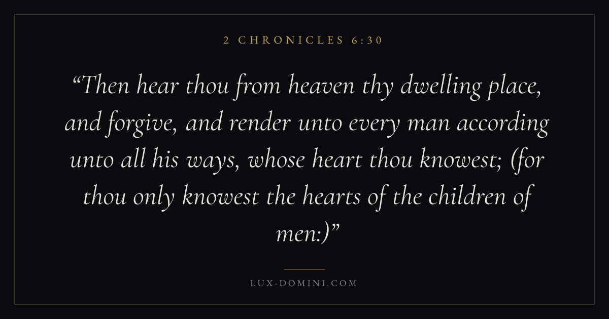 Then hear thou from heaven thy dwelling place, and forgive, and render unto every man according unto all his ways, whose heart thou knowest; (for thou only knowest the hearts of the children of men:)