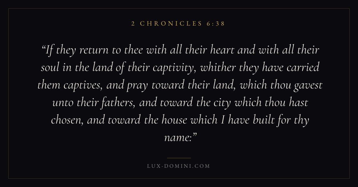 If they return to thee with all their heart and with all their soul in the land of their captivity, whither they have carried them captives, and pray toward their land, which thou gavest unto their fathers, and toward the city which thou hast chosen, and toward the house which I have built for thy name: