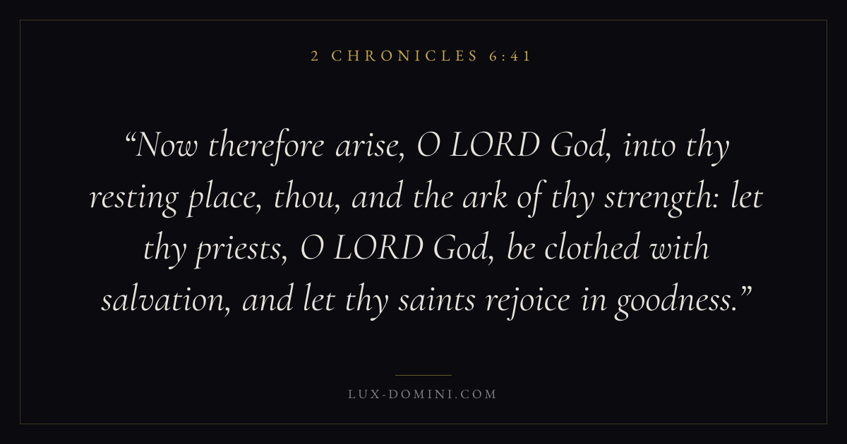 Now therefore arise, O LORD God, into thy resting place, thou, and the ark of thy strength: let thy priests, O LORD God, be clothed with salvation, and let thy saints rejoice in goodness.