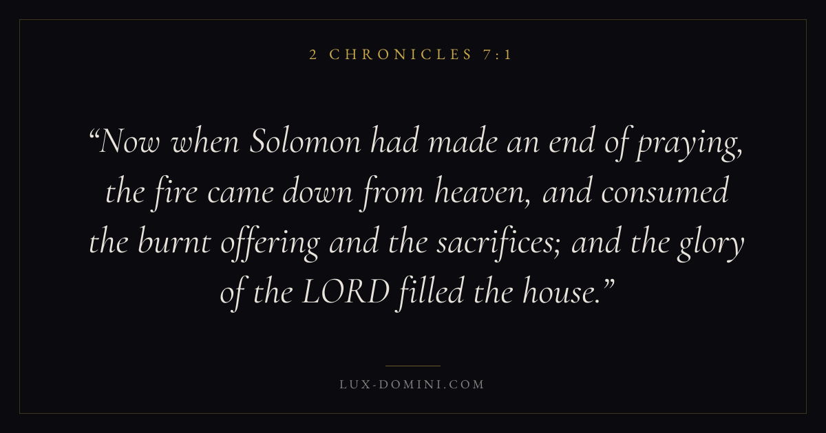 Now when Solomon had made an end of praying, the fire came down from heaven, and consumed the burnt offering and the sacrifices; and the glory of the LORD filled the house.