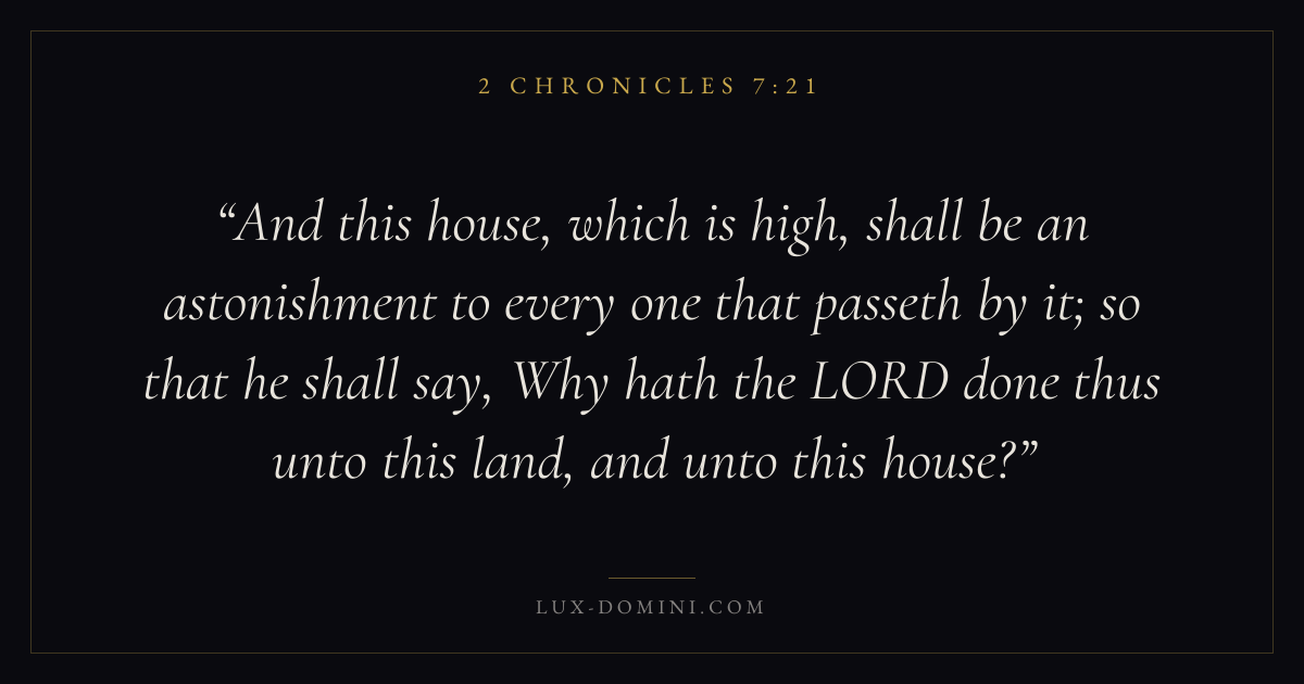 And this house, which is high, shall be an astonishment to every one that passeth by it; so that he shall say, Why hath the LORD done thus unto this land, and unto this house?