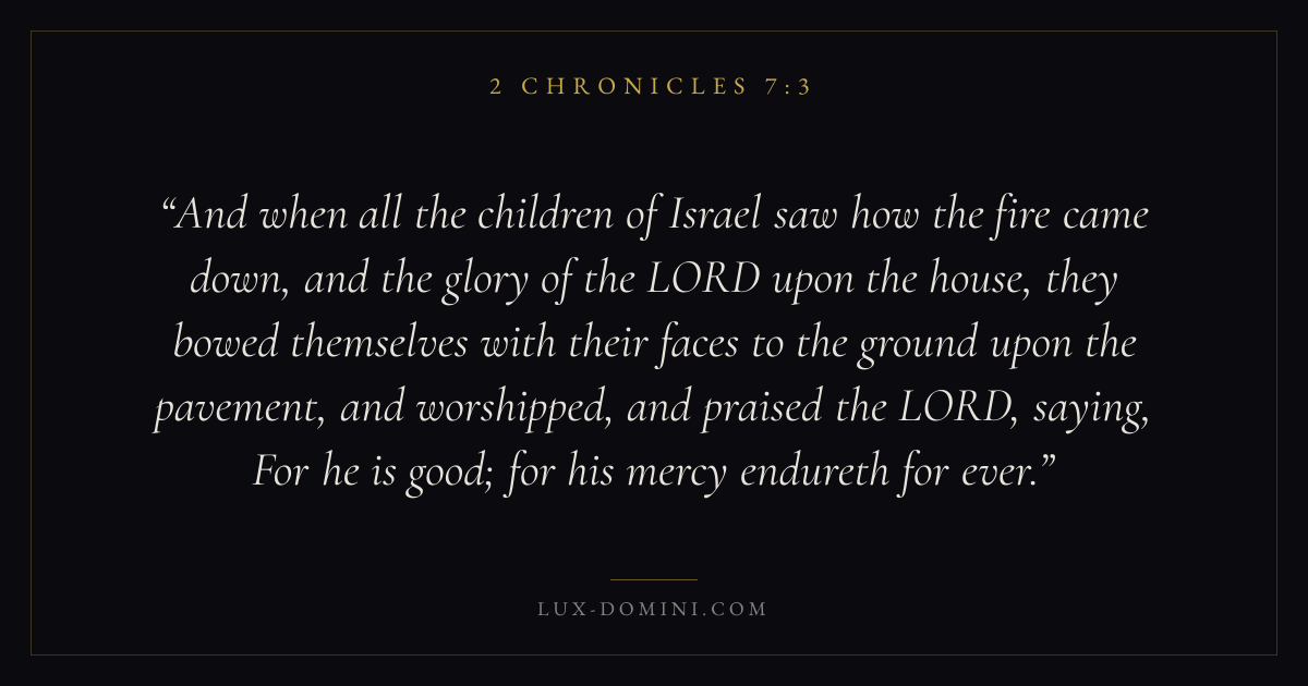 And when all the children of Israel saw how the fire came down, and the glory of the LORD upon the house, they bowed themselves with their faces to the ground upon the pavement, and worshipped, and praised the LORD, saying, For he is good; for his mercy endureth for ever.