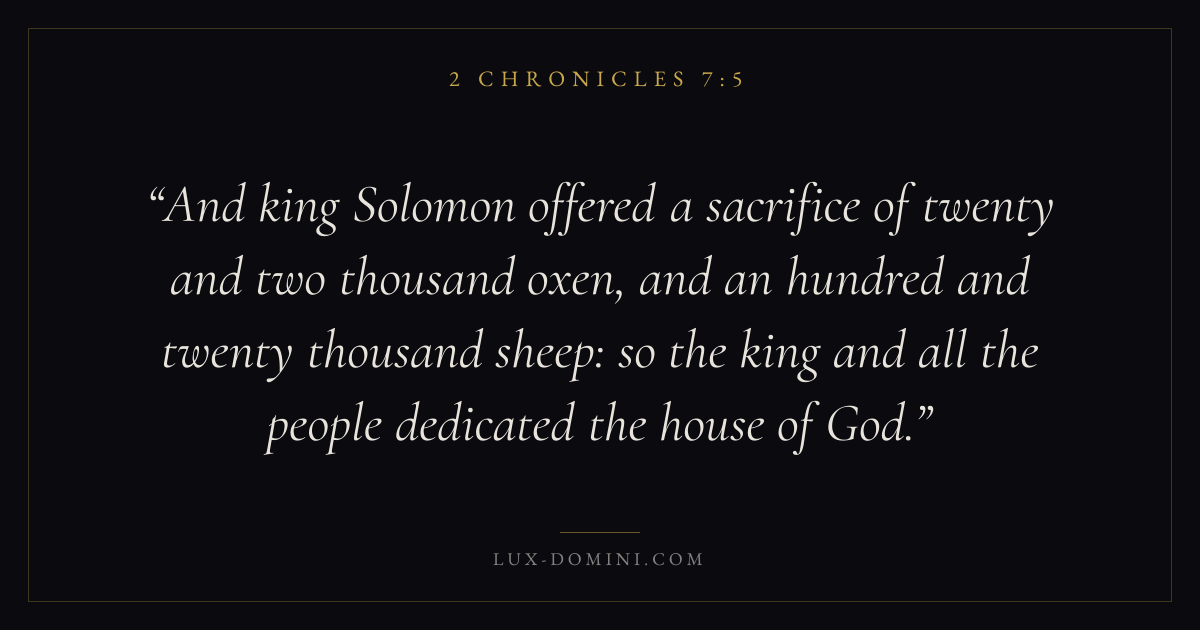 And king Solomon offered a sacrifice of twenty and two thousand oxen, and an hundred and twenty thousand sheep: so the king and all the people dedicated the house of God.