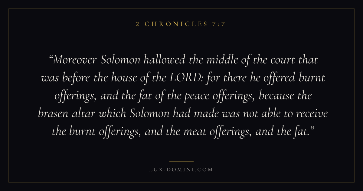 Moreover Solomon hallowed the middle of the court that was before the house of the LORD: for there he offered burnt offerings, and the fat of the peace offerings, because the brasen altar which Solomon had made was not able to receive the burnt offerings, and the meat offerings, and the fat.