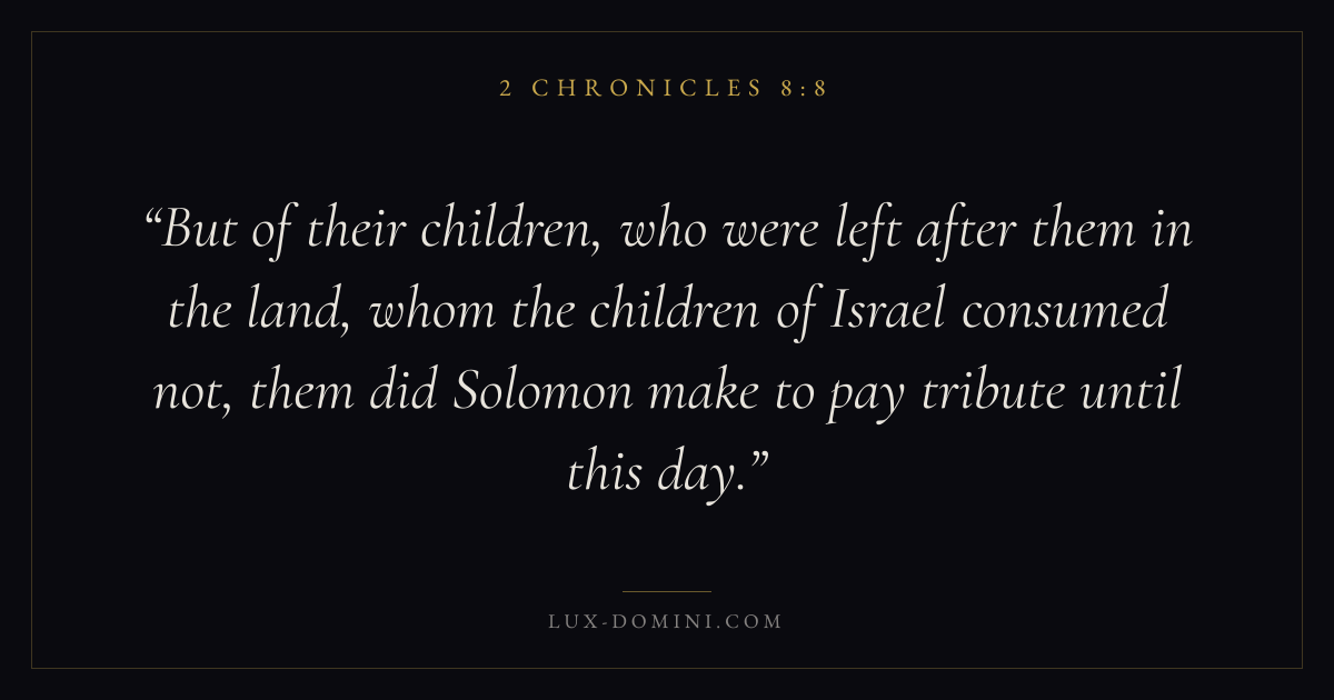 But of their children, who were left after them in the land, whom the children of Israel consumed not, them did Solomon make to pay tribute until this day.