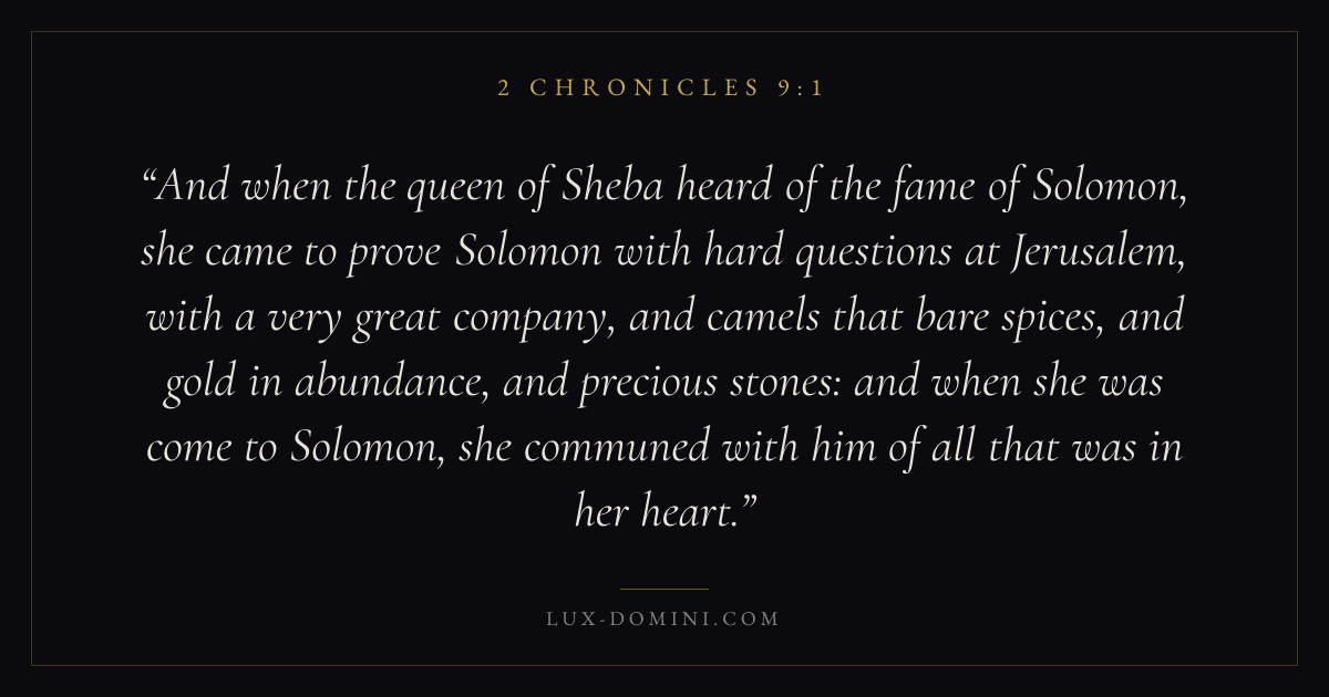 And when the queen of Sheba heard of the fame of Solomon, she came to prove Solomon with hard questions at Jerusalem, with a very great company, and camels that bare spices, and gold in abundance, and precious stones: and when she was come to Solomon, she communed with him of all that was in her heart.
