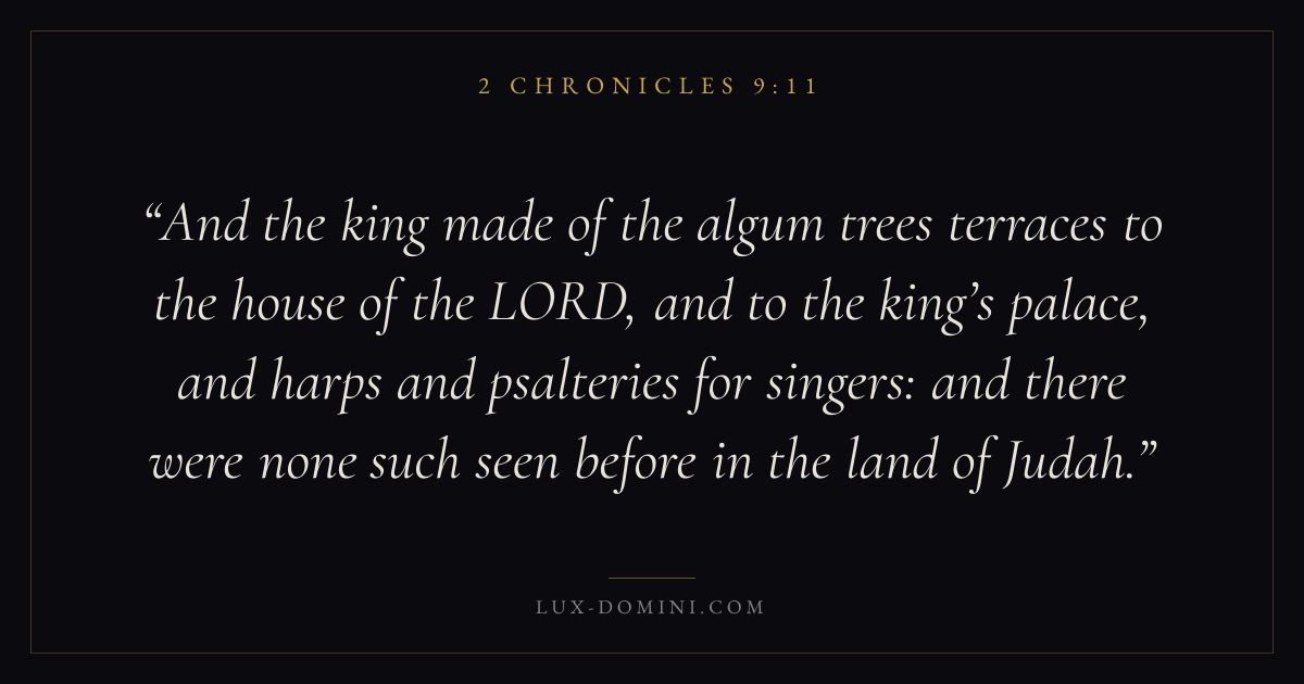 And the king made of the algum trees terraces to the house of the LORD, and to the king’s palace, and harps and psalteries for singers: and there were none such seen before in the land of Judah.