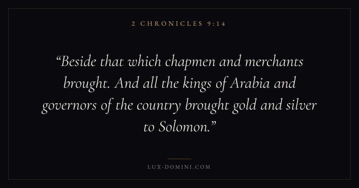 Beside that which chapmen and merchants brought. And all the kings of Arabia and governors of the country brought gold and silver to Solomon.