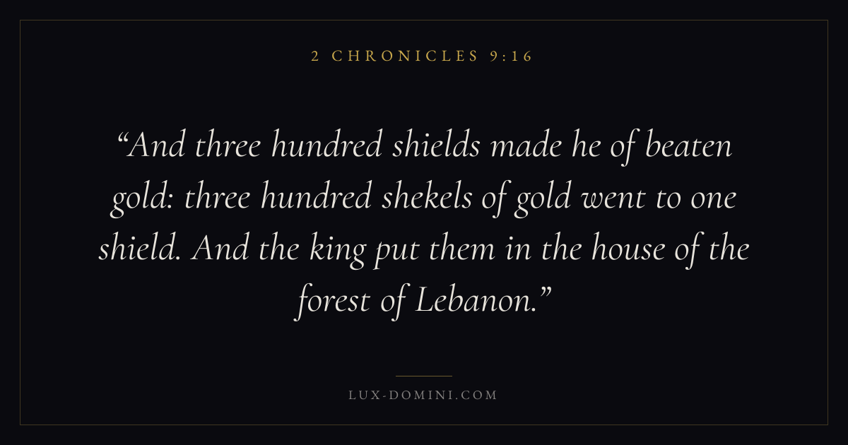 And three hundred shields made he of beaten gold: three hundred shekels of gold went to one shield. And the king put them in the house of the forest of Lebanon.