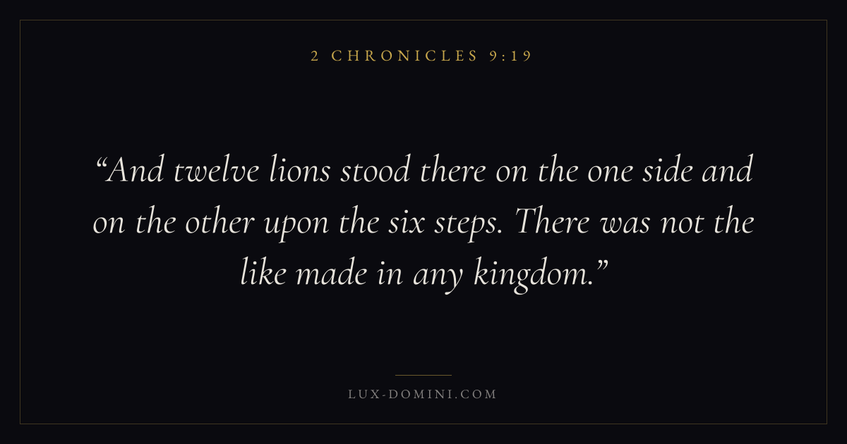 And twelve lions stood there on the one side and on the other upon the six steps. There was not the like made in any kingdom.