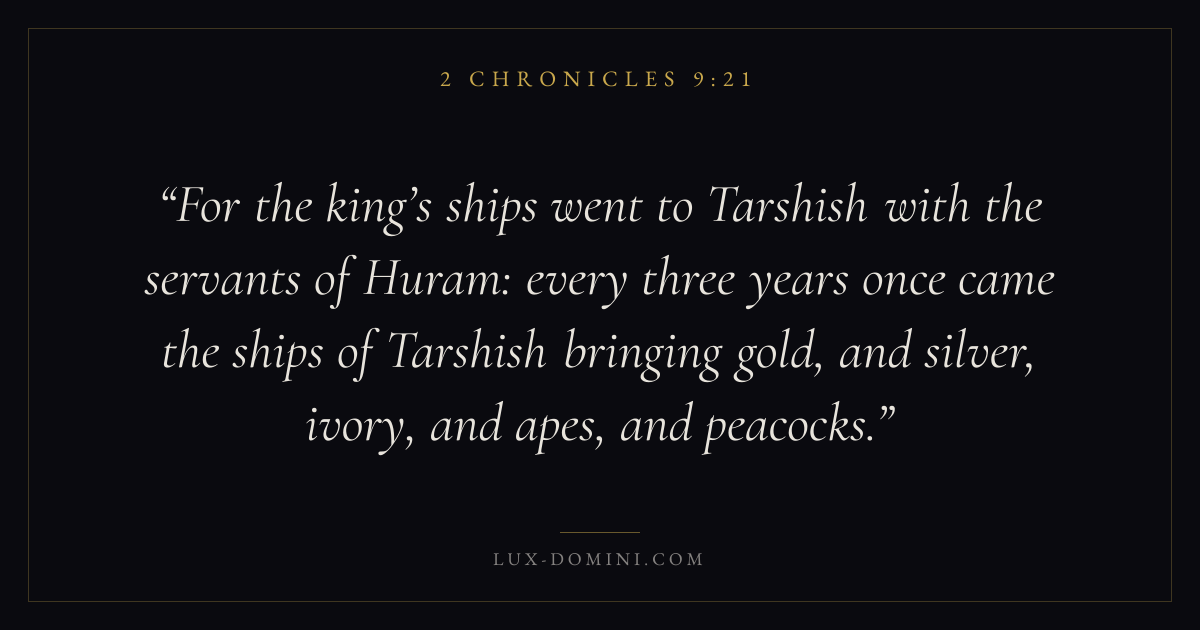For the king’s ships went to Tarshish with the servants of Huram: every three years once came the ships of Tarshish bringing gold, and silver, ivory, and apes, and peacocks.