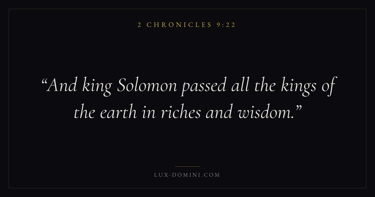 Books / 2 Chronicles / Chapter 9 / Verse 22 ← 2 Chronicles 9:21 2 Chronicles 9:22 2 Chronicles 9:23 → And king Solomon passed all the kings of the earth in riches and wisdom. Download verse card Share on Twitter Share on Facebook Pin it ✦ Key themes LovePrayerWisdomJustice and mercyTemple Read with 2 Chronicles 9:202 Chronicles 9:21John 3:161 Corinthians 13:4 Related topics Bible verses about loveBible verses about prayerBible verses about wisdomBible verses about justice and mercy ✦ 2 Chronicles Chapter 9 verses V. 1 V. 2 V. 3 V. 4 V. 5 V. 6 V. 7 V. 8 V. 9 V. 10 V. 11 V. 12 V. 13 V. 14 V. 15 V. 16 V. 17 V. 18 V. 19 V. 20 V. 21 V. 22 V. 23 V. 24 V. 25 V. 26 V. 27 V. 28 V. 29 V. 30 V. 31