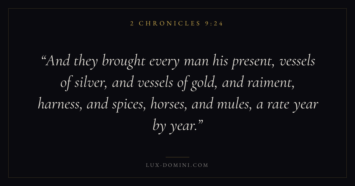 And they brought every man his present, vessels of silver, and vessels of gold, and raiment, harness, and spices, horses, and mules, a rate year by year.