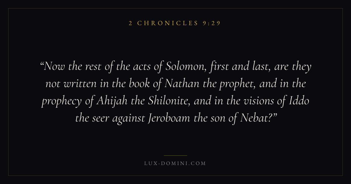 Now the rest of the acts of Solomon, first and last, are they not written in the book of Nathan the prophet, and in the prophecy of Ahijah the Shilonite, and in the visions of Iddo the seer against Jeroboam the son of Nebat?
