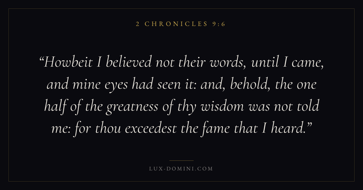 Howbeit I believed not their words, until I came, and mine eyes had seen it: and, behold, the one half of the greatness of thy wisdom was not told me: for thou exceedest the fame that I heard.