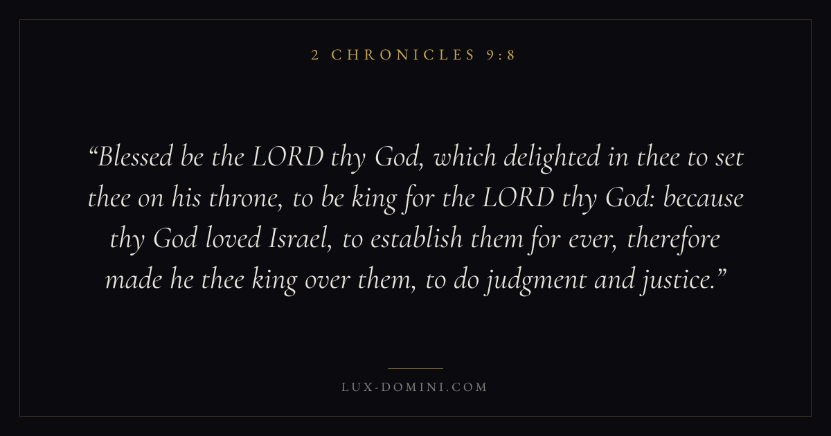 Blessed be the LORD thy God, which delighted in thee to set thee on his throne, to be king for the LORD thy God: because thy God loved Israel, to establish them for ever, therefore made he thee king over them, to do judgment and justice.