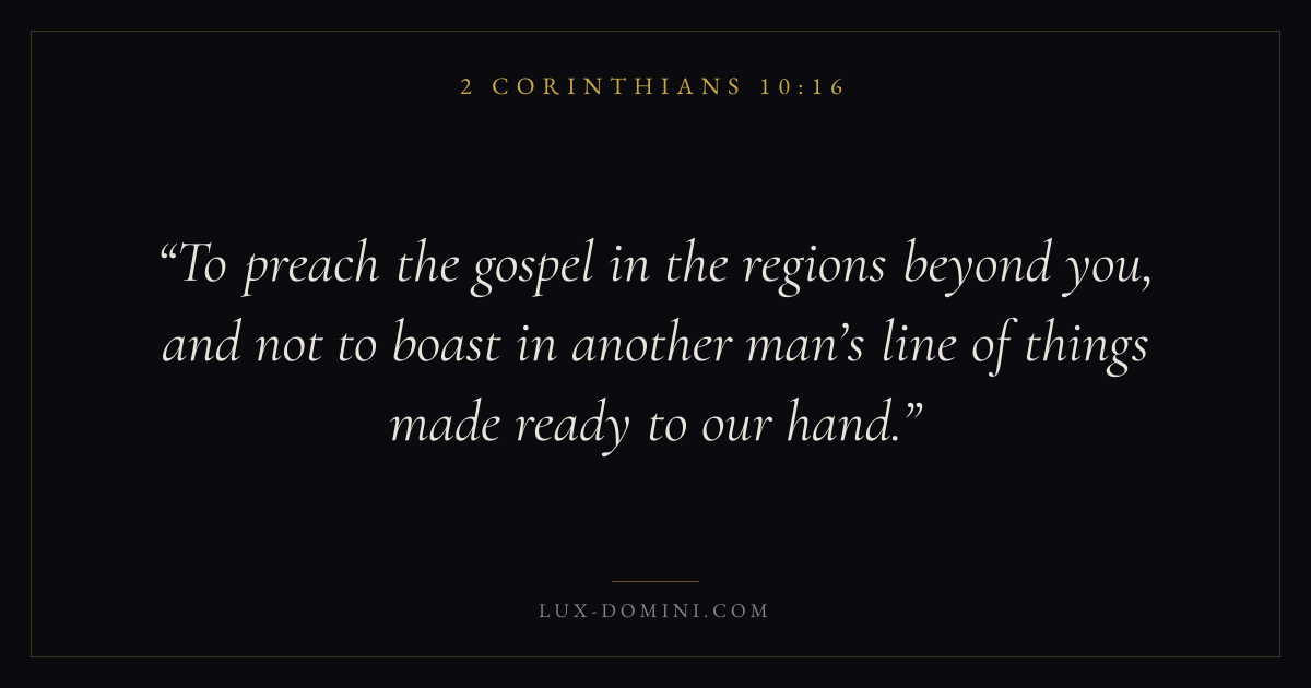 To preach the gospel in the regions beyond you, and not to boast in another man’s line of things made ready to our hand.