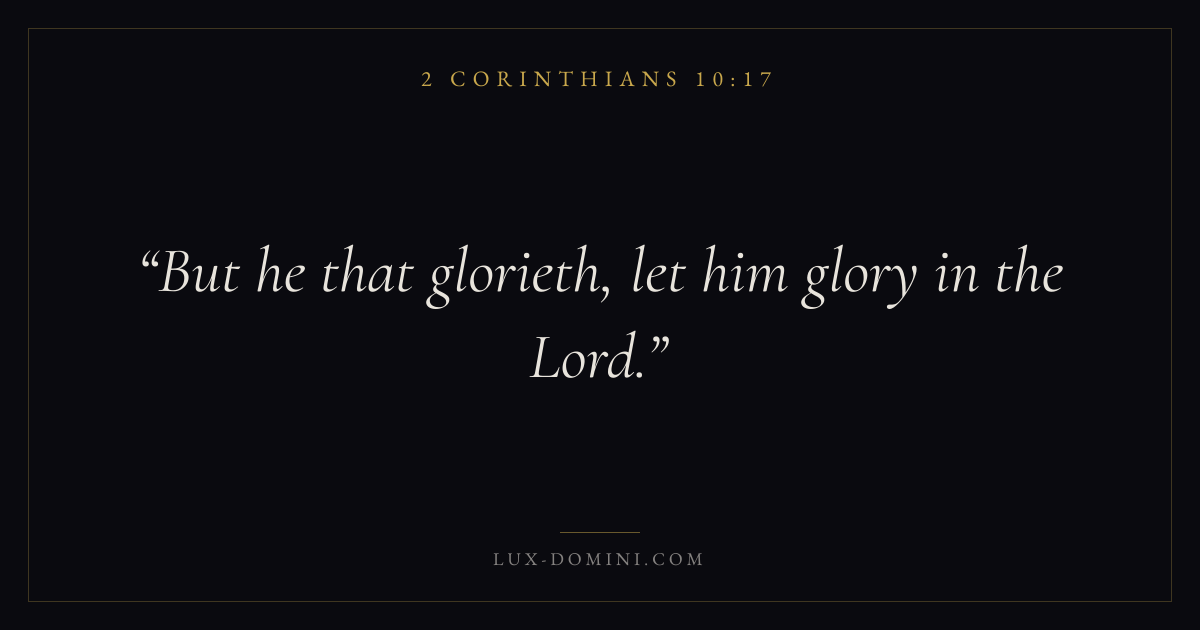 Books / 2 Corinthians / Chapter 10 / Verse 17 ← 2 Corinthians 10:16 2 Corinthians 10:17 2 Corinthians 10:18 → But he that glorieth, let him glory in the Lord. Download verse card Share on Twitter Share on Facebook Pin it ✦ Key themes Suffering and trialsHumilityWeaknessMinistry Read with 2 Corinthians 10:162 Corinthians 10:18Romans 8:182 Corinthians 4:17 Related topics Bible verses about suffering and trialsBible verses about humilityBible verses about strength ✦ 2 Corinthians Chapter 10 verses V. 1 V. 2 V. 3 V. 4 V. 5 V. 6 V. 7 V. 8 V. 9 V. 10 V. 11 V. 12 V. 13 V. 14 V. 15 V. 16 V. 17 V. 18