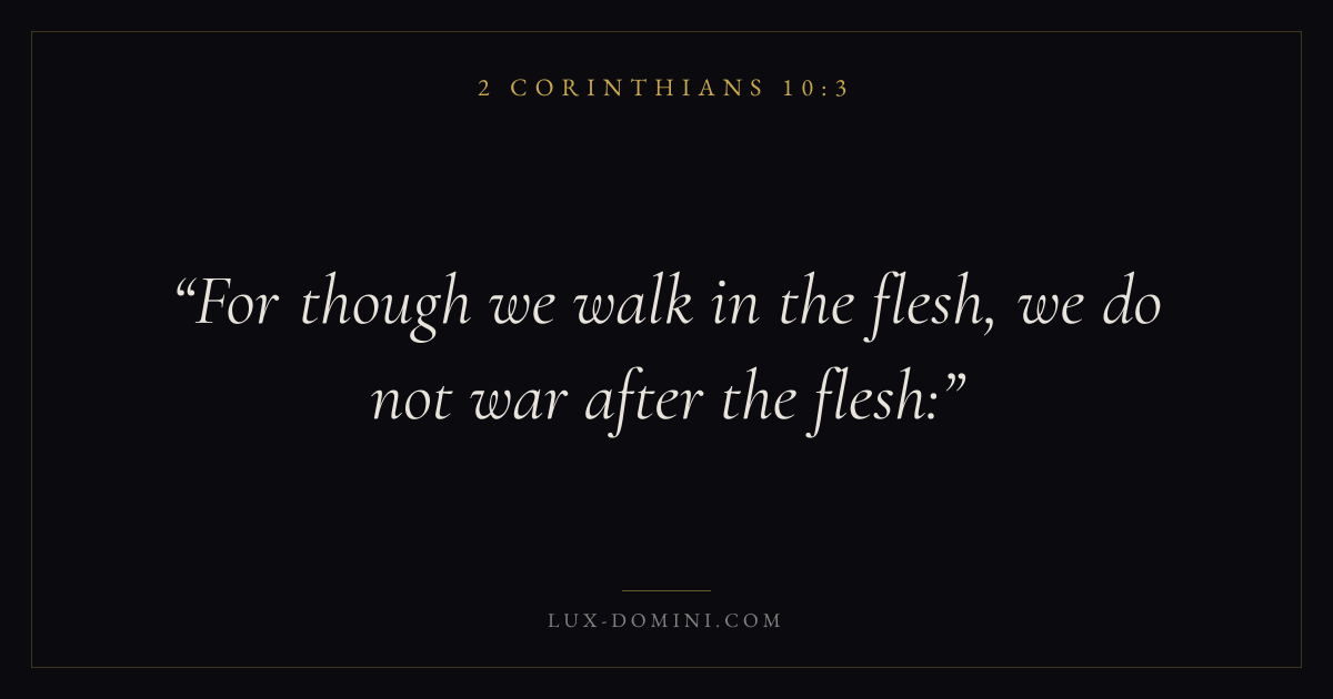 Books / 2 Corinthians / Chapter 10 / Verse 3 ← 2 Corinthians 10:2 2 Corinthians 10:3 2 Corinthians 10:4 → For though we walk in the flesh, we do not war after the flesh: Download verse card Share on Twitter Share on Facebook Pin it ✦ Key themes Suffering and trialsWeaknessMinistryReconciliation Read with 2 Corinthians 10:12 Corinthians 10:2Romans 8:182 Corinthians 4:17 Related topics Bible verses about suffering and trialsBible verses about strength ✦ 2 Corinthians Chapter 10 verses V. 1 V. 2 V. 3 V. 4 V. 5 V. 6 V. 7 V. 8 V. 9 V. 10 V. 11 V. 12 V. 13 V. 14 V. 15 V. 16 V. 17 V. 18