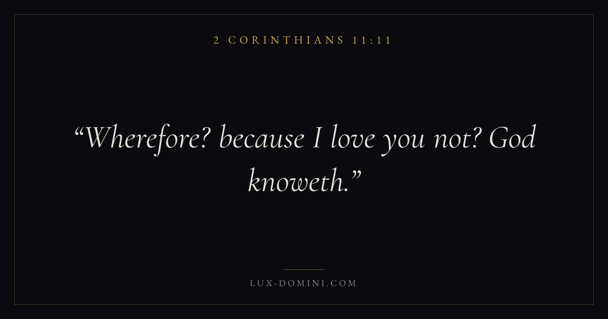Books / 2 Corinthians / Chapter 11 / Verse 11 ← 2 Corinthians 11:10 2 Corinthians 11:11 2 Corinthians 11:12 → Wherefore? because I love you not? God knoweth. Download verse card Share on Twitter Share on Facebook Pin it ✦ Key themes LoveSuffering and trialsHumilityWeakness Read with 2 Corinthians 11:102 Corinthians 11:12John 3:161 Corinthians 13:4 Related topics Bible verses about loveBible verses about suffering and trialsBible verses about humilityBible verses about strength ✦ 2 Corinthians Chapter 11 verses V. 1 V. 2 V. 3 V. 4 V. 5 V. 6 V. 7 V. 8 V. 9 V. 10 V. 11 V. 12 V. 13 V. 14 V. 15 V. 16 V. 17 V. 18 V. 19 V. 20 V. 21 V. 22 V. 23 V. 24 V. 25 V. 26 V. 27 V. 28 V. 29 V. 30 V. 31 V. 32 V. 33