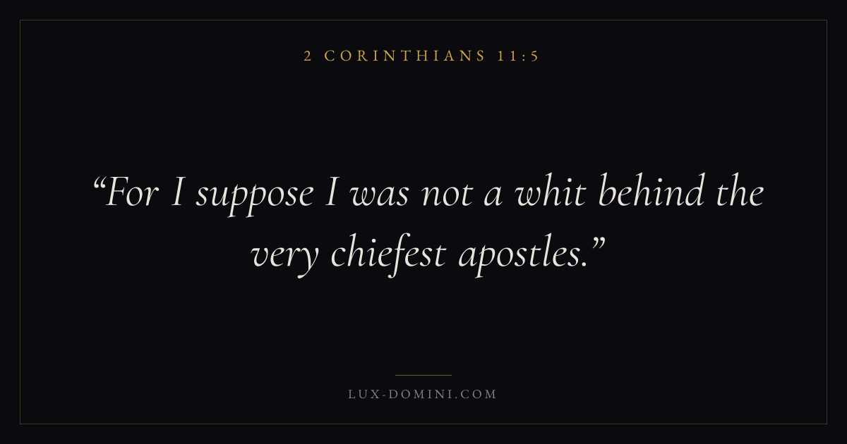 Books / 2 Corinthians / Chapter 11 / Verse 5 ← 2 Corinthians 11:4 2 Corinthians 11:5 2 Corinthians 11:6 → For I suppose I was not a whit behind the very chiefest apostles. Download verse card Share on Twitter Share on Facebook Pin it ✦ Key themes Suffering and trialsHumilityWeaknessMinistry Read with 2 Corinthians 11:12 Corinthians 11:2Romans 8:182 Corinthians 4:17 Related topics Bible verses about suffering and trialsBible verses about humilityBible verses about strength ✦ 2 Corinthians Chapter 11 verses V. 1 V. 2 V. 3 V. 4 V. 5 V. 6 V. 7 V. 8 V. 9 V. 10 V. 11 V. 12 V. 13 V. 14 V. 15 V. 16 V. 17 V. 18 V. 19 V. 20 V. 21 V. 22 V. 23 V. 24 V. 25 V. 26 V. 27 V. 28 V. 29 V. 30 V. 31 V. 32 V. 33