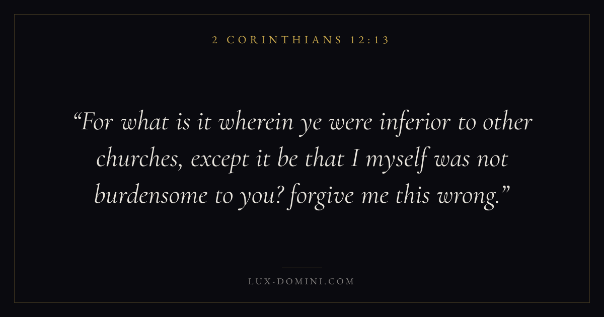 For what is it wherein ye were inferior to other churches, except it be that I myself was not burdensome to you? forgive me this wrong.