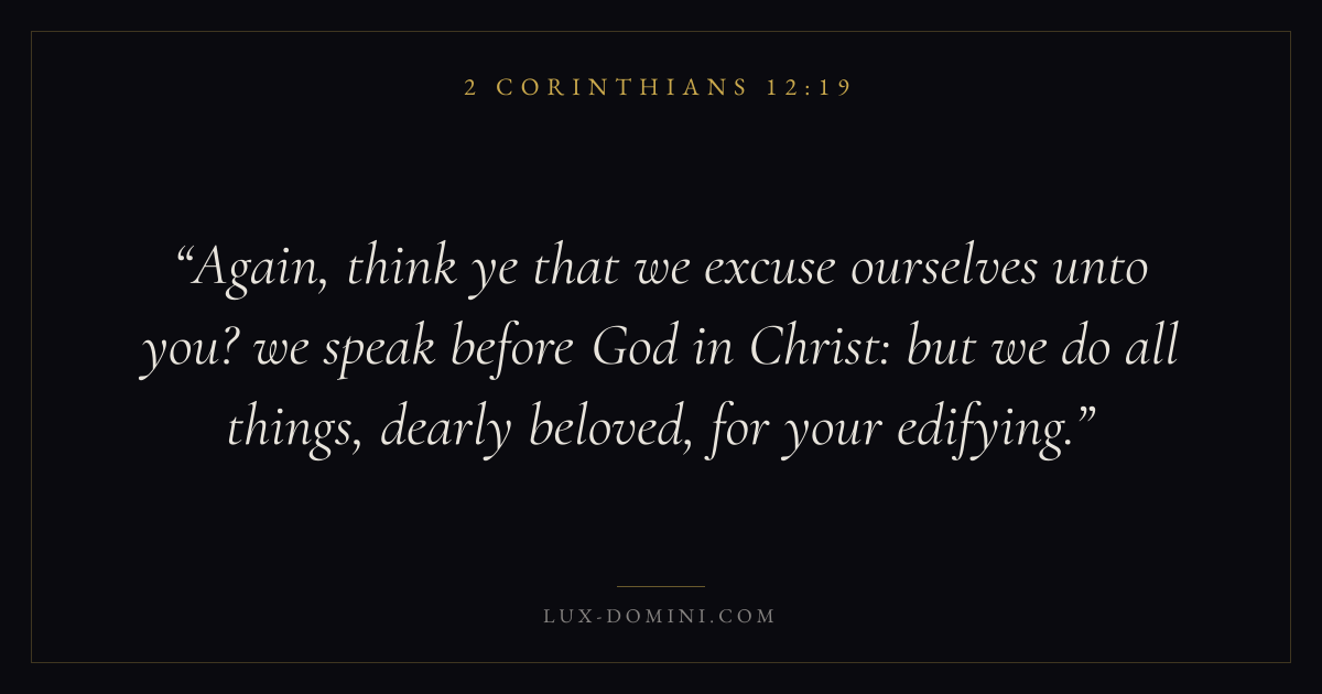 Again, think ye that we excuse ourselves unto you? we speak before God in Christ: but we do all things, dearly beloved, for your edifying.