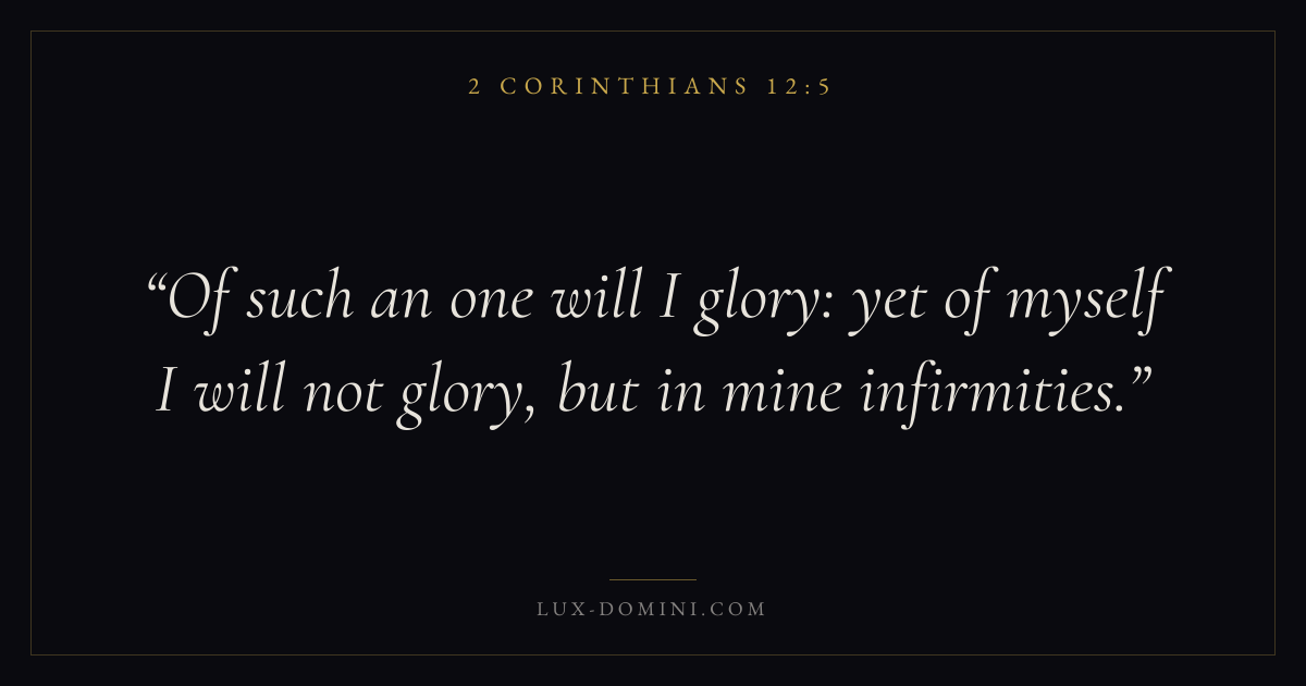 Books / 2 Corinthians / Chapter 12 / Verse 5 ← 2 Corinthians 12:4 2 Corinthians 12:5 2 Corinthians 12:6 → Of such an one will I glory: yet of myself I will not glory, but in mine infirmities. Download verse card Share on Twitter Share on Facebook Pin it ✦ Key themes Suffering and trialsWeaknessMinistryReconciliation Read with 2 Corinthians 12:62 Corinthians 12:7Romans 8:182 Corinthians 4:17 Related topics Bible verses about suffering and trialsBible verses about strength ✦ 2 Corinthians Chapter 12 verses V. 1 V. 2 V. 3 V. 4 V. 5 V. 6 V. 7 V. 8 V. 9 V. 10 V. 11 V. 12 V. 13 V. 14 V. 15 V. 16 V. 17 V. 18 V. 19 V. 20 V. 21