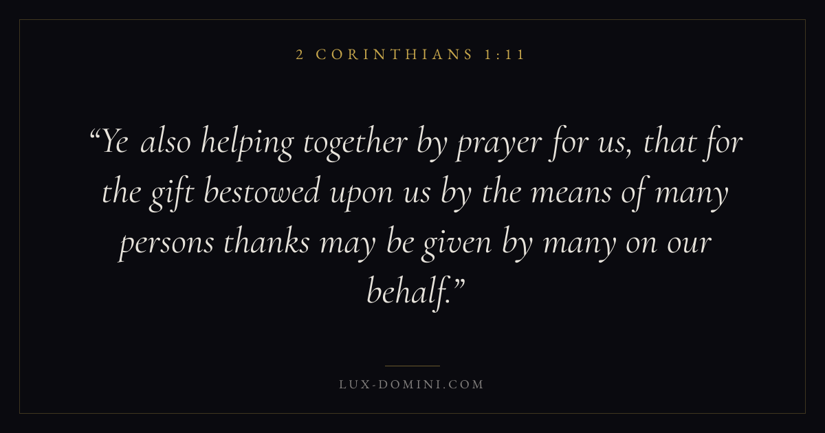 Ye also helping together by prayer for us, that for the gift bestowed upon us by the means of many persons thanks may be given by many on our behalf.