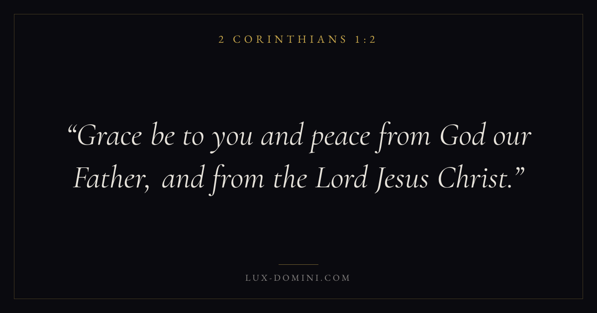 Books / 2 Corinthians / Chapter 1 / Verse 2 ← 2 Corinthians 1:1 2 Corinthians 1:2 2 Corinthians 1:3 → Grace be to you and peace from God our Father, and from the Lord Jesus Christ. Download verse card Share on Twitter Share on Facebook Pin it ✦ Key themes Anxiety and fearSuffering and trialsJustice and mercyPeaceWeakness Read with 2 Corinthians 1:1Philippians 4:6Isaiah 41:10Romans 8:18 Related topics Bible verses about anxiety and fearBible verses about suffering and trialsBible verses about justice and mercyBible verses about peaceBible verses about strength ✦ 2 Corinthians Chapter 1 verses V. 1 V. 2 V. 3 V. 4 V. 5 V. 6 V. 7 V. 8 V. 9 V. 10 V. 11 V. 12 V. 13 V. 14 V. 15 V. 16 V. 17 V. 18 V. 19 V. 20 V. 21 V. 22 V. 23 V. 24
